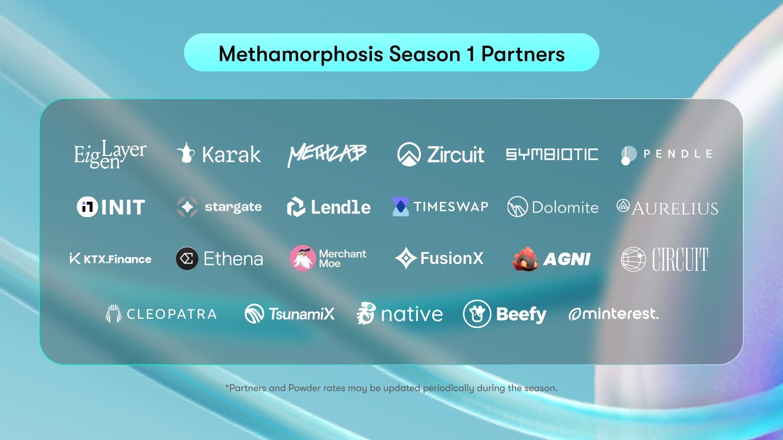 Protocolos L2 > Pendle, Stargate, Init, Lendle, Native, Aurelius, TimeSwap, Dolomite, Methlab, Minterest, Tsunami, KTX, Circuit, Beefy, Ethena, Merchant, Agnidex, FusionX y Cleopatra generan 20 Powder por mETH