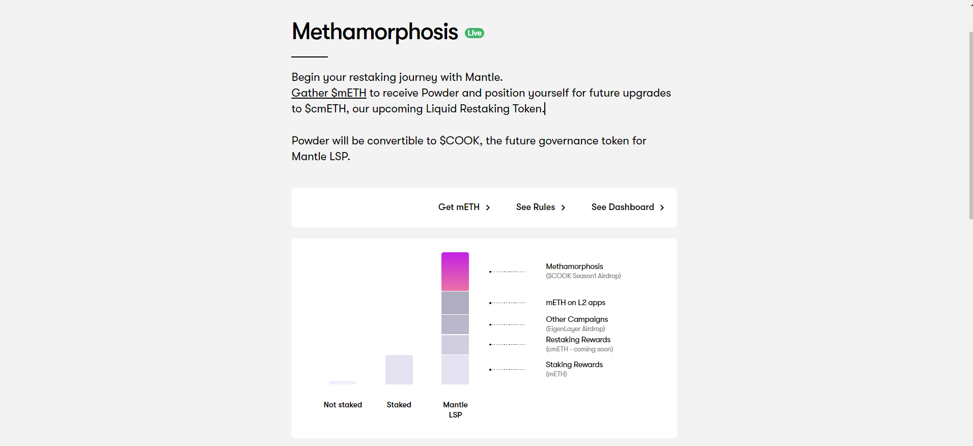 Desde el 01/07 y durante los próximos 100 días, si participas en estas tareas (mainnet) podrás empezar a acumular puntos Powder… estos puntos se convertirán en tokens COOK (el futuro token de gobernanza de Mantle LSP)